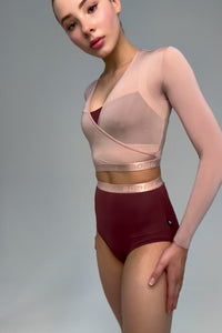 BODY GLOSS CROP top is sheer with a beautiful sheen, and designed to wear under or over leotards to cover arms with that barely-there feeling. With a v-neck wrap front, this can be worn with v-neck to the front or the back.