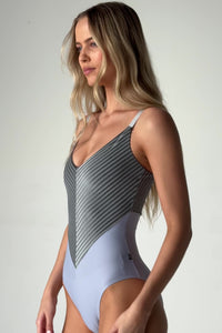 RAFAELA is a velvet corset-inspired leotard defined by sculptural lines and a soft, chevron mesh that contours the silhouette.