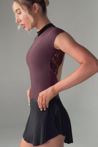 キュートなキャップスリーブ、ドラマチックなベルベットの襟、美しいレースのバックパネルが付いたTATIANAレオタード。最先端のLEOPREME™ファブリックを使用。