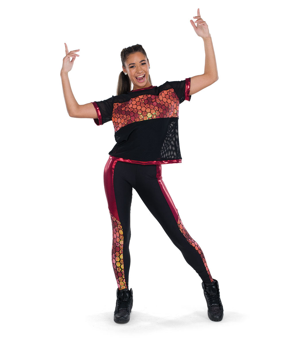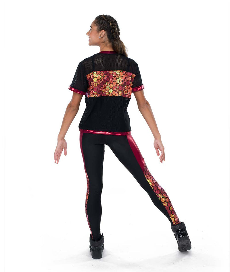 Sequin hexagon pattern spandex and fishnet t-shirt with foil lycra trim. Spandex cami unitard with foil lycra and sequin hexagon pattern spandex insets. Made in the USA.