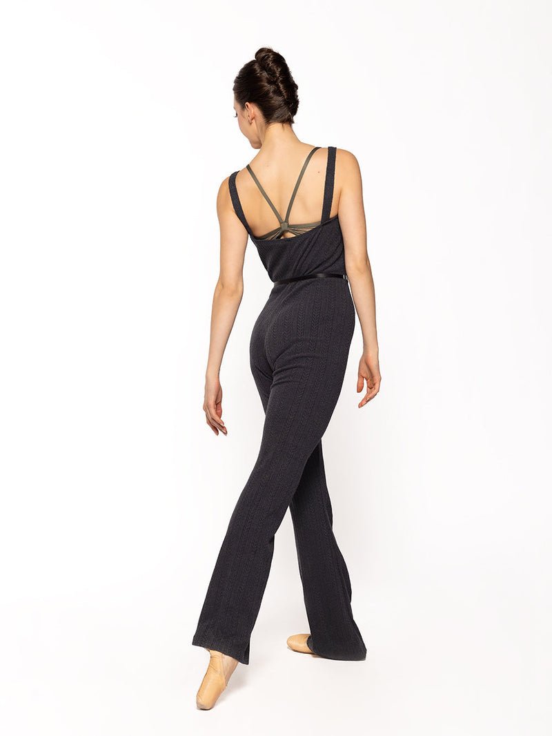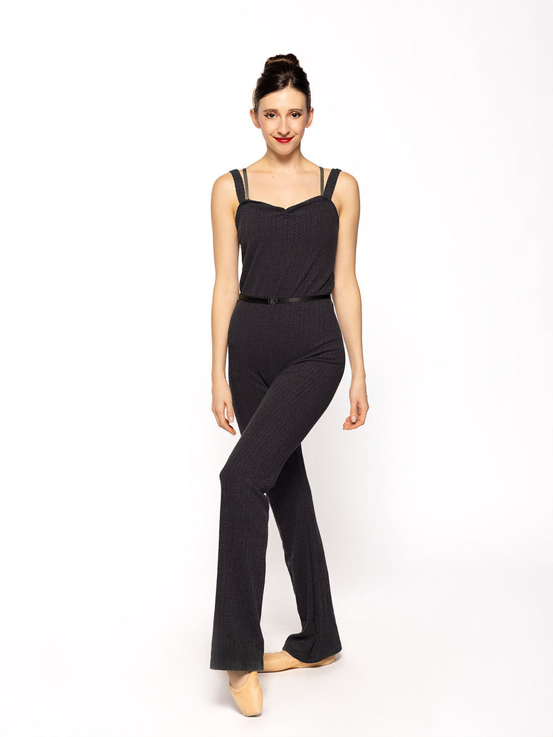 The Deven Arrow Knit Unitard, now available in off-black Obsidian, features full-length legs, a sweetheart neckline with delicate straps, and an adjustable belt for layering to stay warm during class and rehearsal.