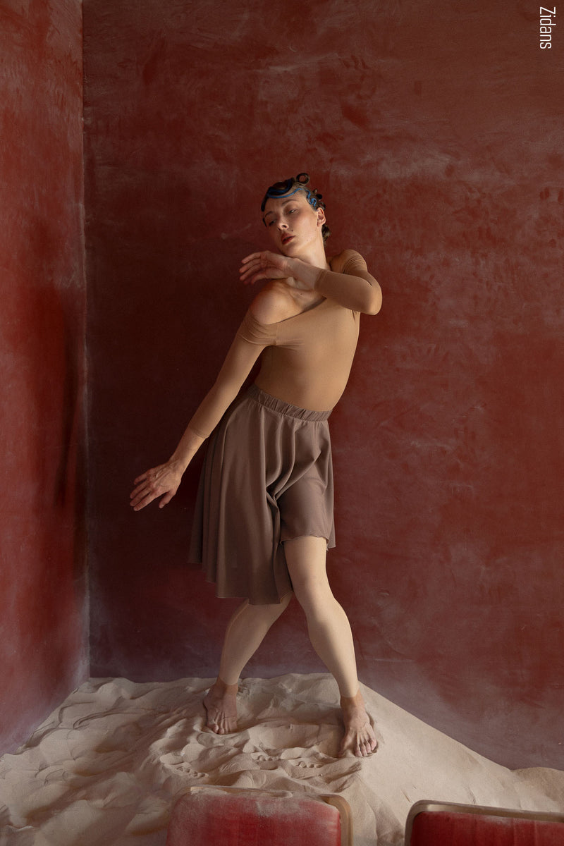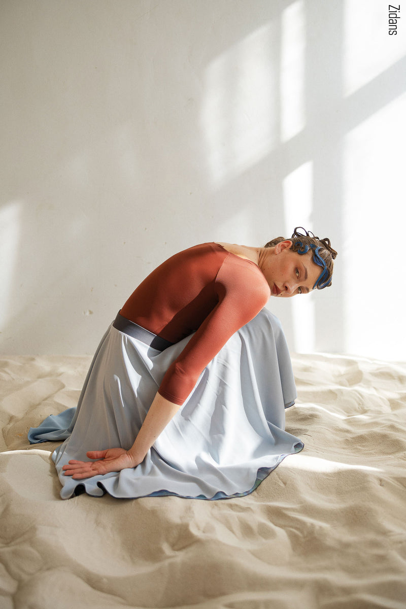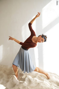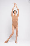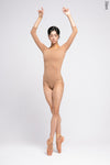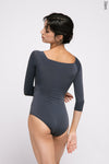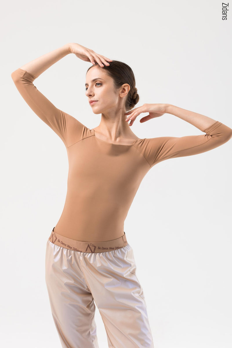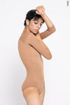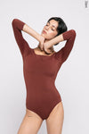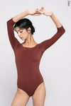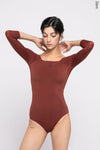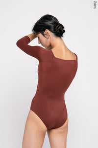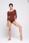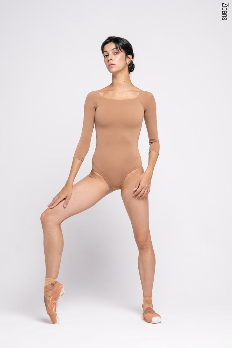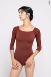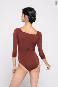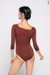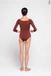 Design. Brown 3/4 sleeve ballet leotard. Minimum stitches — maximum comfort. Leotard emphasizes the neckline and demonstrates the wrists. This bodysuit can also be worn as a swimsuit.