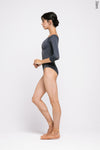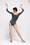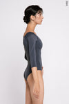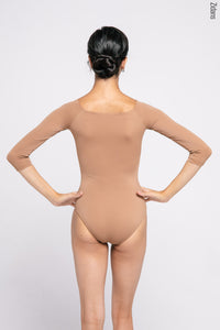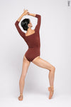 エレガントなブラウンの3/4スリーブバレエレオタード。ミニマルな縫い目で、肌に優しく快適な着心地を実現。デコルテラインを美しく引き立て、手首の動きを優雅に見せてくれます。また、このレオタードはスイムウェアとしても着用可能です。