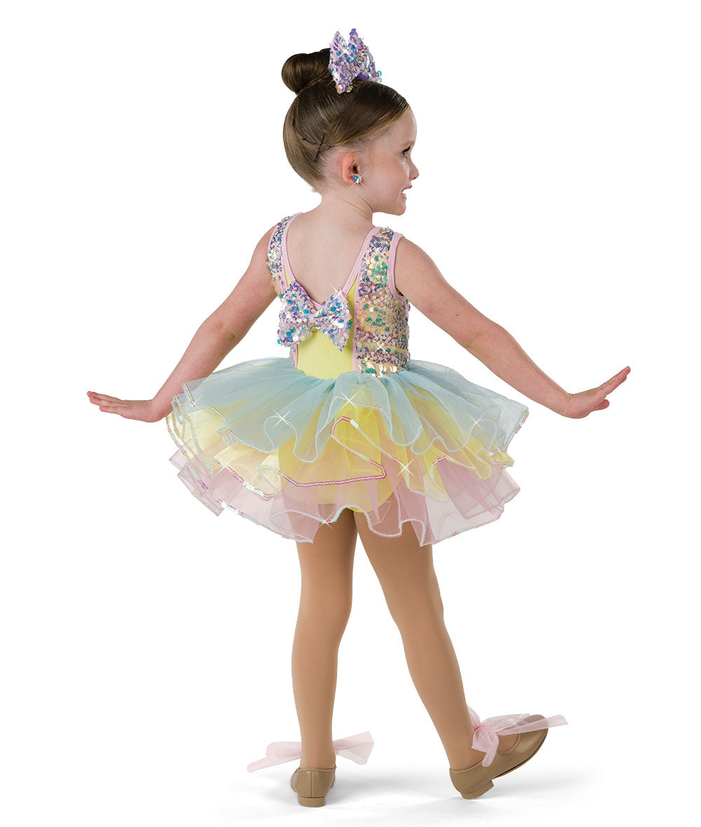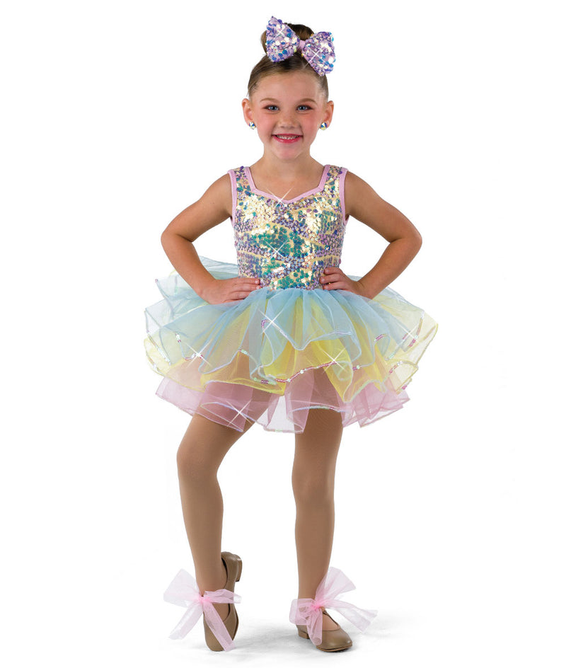 Lined iridescent sequin and spandex leotard with attached bow. Attached sequin trimmed organza tutu. Shoe bows sold separately. Imported.