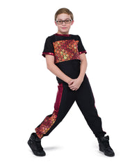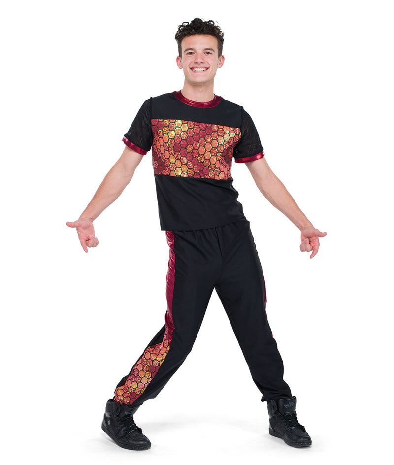 Sequin hexagon pattern, solid spandex and fishnet t-shirt with foil lycra trim. Spandex joggers with foil lycra and sequin hexagon pattern spandex insets. Made in the USA.