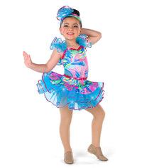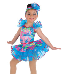 トロピカルプリントと無地のスパンデックス素材のスカート付きレオタードで、メッシュのインセットとスパンコールのトリムが施されています。スパンコールトリムのオーガンザのフリルとチュチュが付属しています。アメリカ製。
