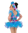 Tropical print and solid spandex skirted leotard with mesh inset and sequin trim. Attached sequin trimmed organza ruffles and tutu. Made in the USA.