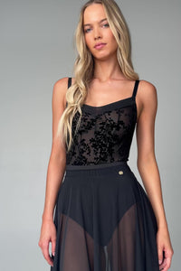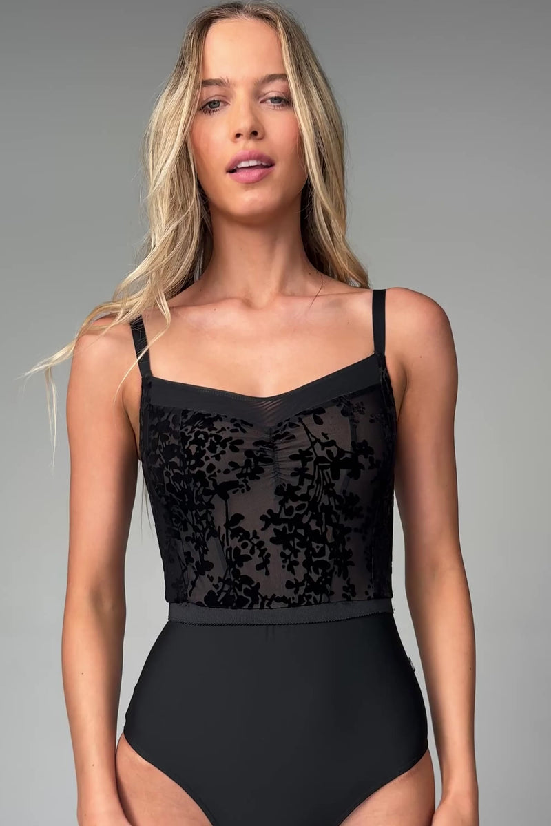 OPHELIA camisole leotard has a Limited Edition flocked velvet bodice with a pinch, mesh trimming and a waist defining ribbon. Featuring our cutting edge LEOPREME™ fabric - breathable and supportive. It has a soft-touch comfortable feel, promoting microcirculation, muscle oxygenation and moisture management.