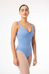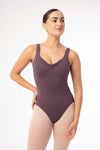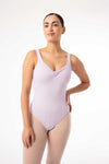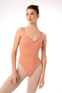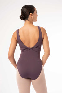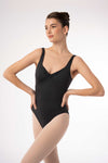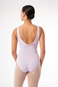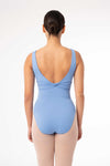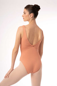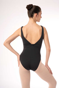 Leotard with wide straps and a knot detail on the front and back. Designed with a v-shaped open back. Full front soft lining.