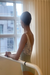 スタッフ②:「Mサイズがぴったりです」 身長160cm / 体重54kg / ガース147cm / バスト周り84cm / ヒップ周り94.5cm