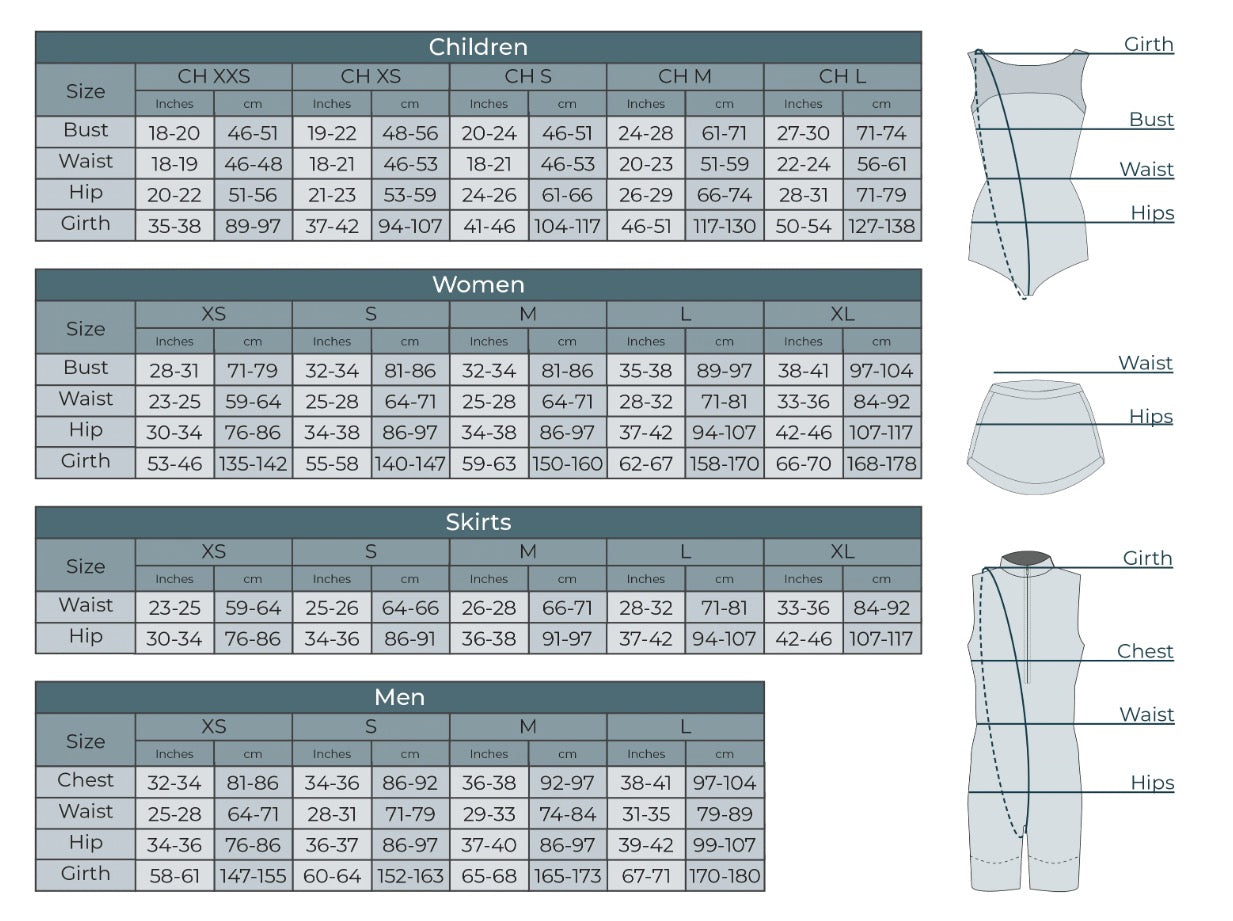 レオタードのサイズ選びは、ガース(片方の肩から股下を通って一周した長さ)が、とても重要となります。