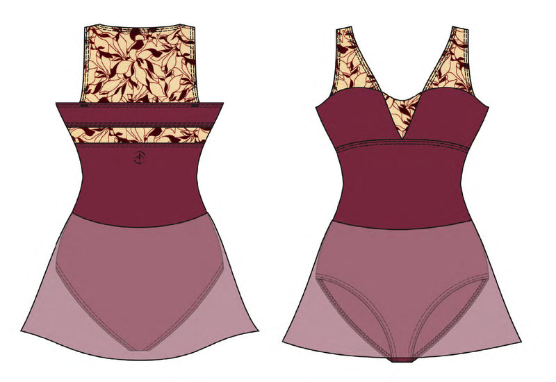 Fancy 3-fabric leotard-skirt combo. Solid color microfiber and flocked sheer stretch tulle yokes crossing on the upper body. Heart-shaped neckline. Sheer tulle skirt. Front lining.